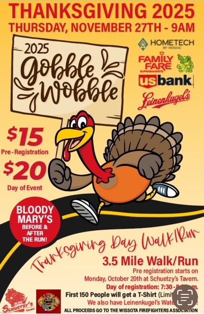 2025 Goggle Wobble 3.5 mile walk/run. Pre-registration: $15 Race Day: $20 Preregister at Schuetzy's Tavern. Register Day of Event: 7:30-8:00 am. First 150 people will get a t-shirt.