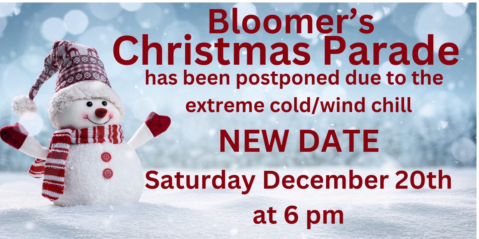 UPDATE: Due to the EXTREME Cold/Wind Chill that is suppose to hit us this Saturday, Dec 13 and our concern for everyone’s safety, we are MOVING the Bloomer Christmas Parade to next Saturday December 20th at 6 pm**