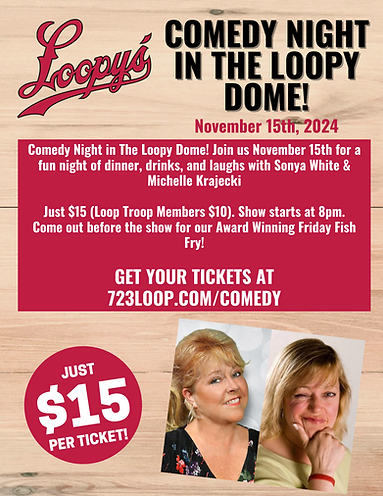 🎉 COMEDY NIGHT IN THE LOOPY DOME! 🤣🎉 Join us for a HILARIOUS Comedy Night in The Loopy Dome on November 15th! Featuring Sonya White & Michelle Krajecki