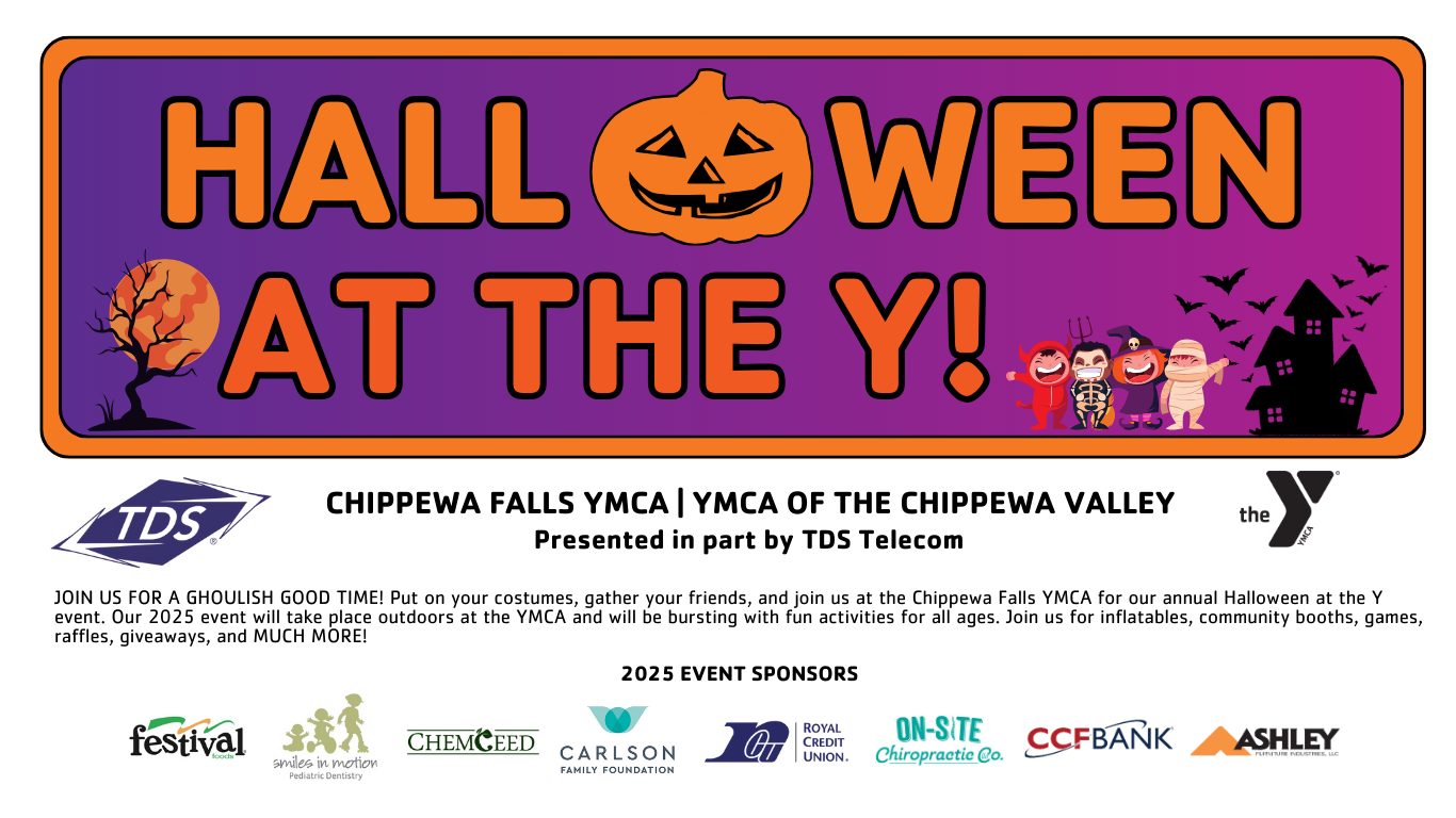 Put on your costumes, gather your friends, and join the Chippewa Falls YMCA for its annual Halloween at the Y event. The 2025 event will take place outdoors at the YMCA and will be bursting with fun activities for all ages. There will be inflatables, community booths, games, raffles, giveaways, and MUCH MORE!
