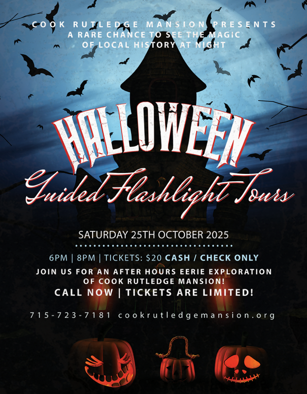 Join us for the Cook-Rutledge Mansion Guided Flashlight Tour on Saturday, October 25th, 2025. Experience the beauty and mystery of the mansion after dark with a guided evening tour.
