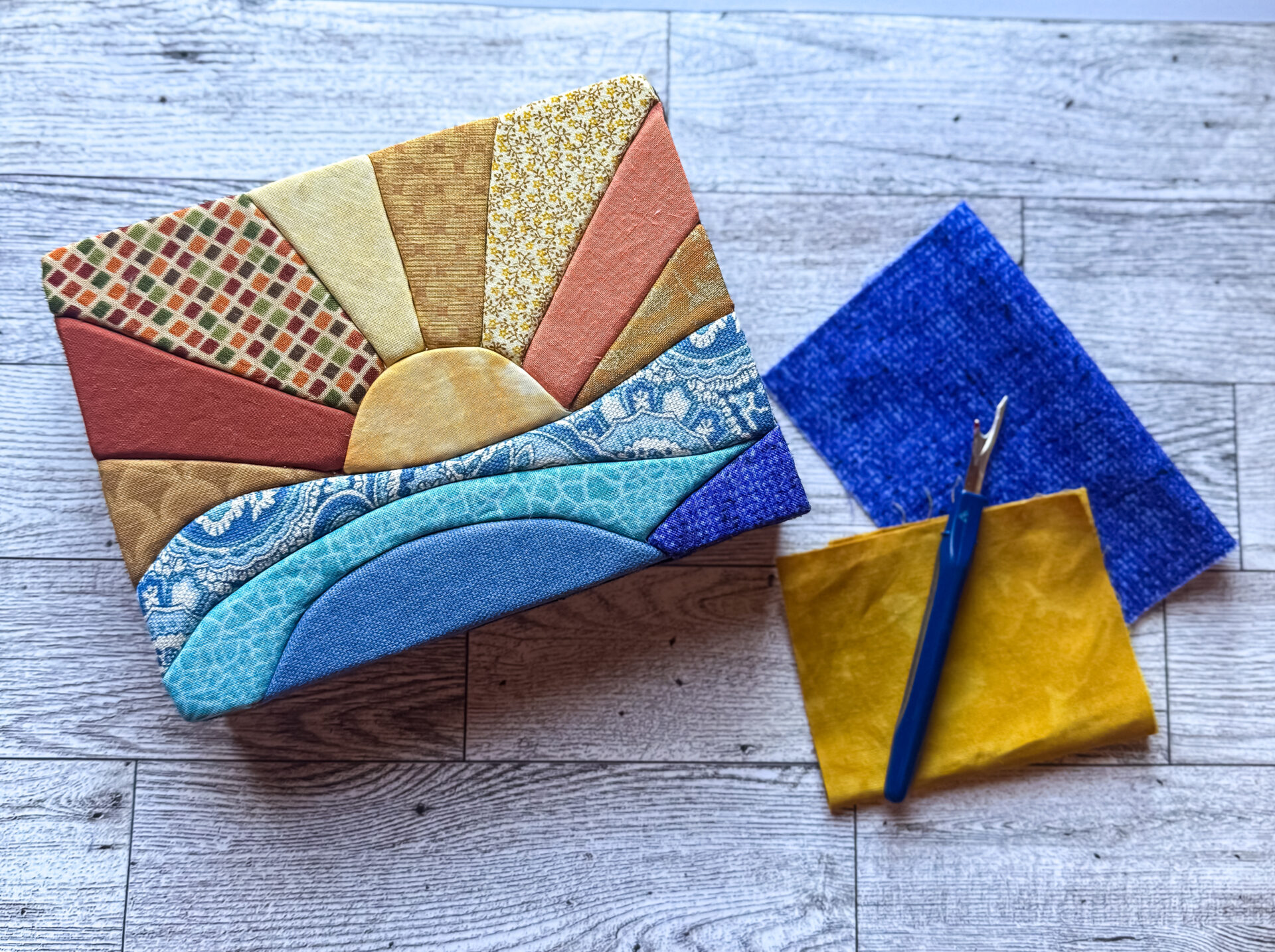 In this beginner-friendly, hands-on workshop, you’ll be guided step by step as you create a textured fabric artwork inspired by a peaceful sunrise over ocean waves with simple tucking techniques. No sewing or prior experience is needed.