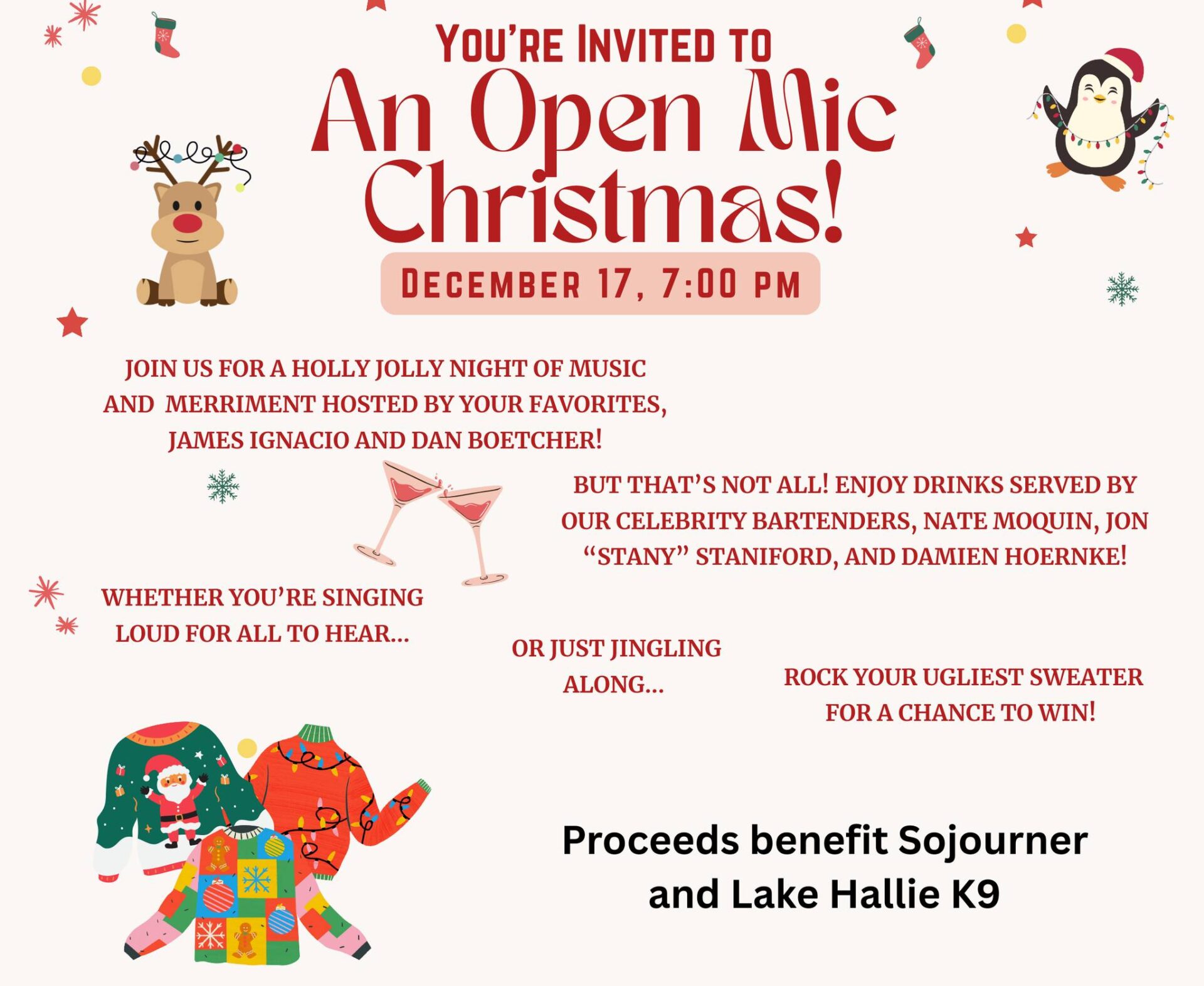 A special Christmas Open Mic Night at River Jams, hosted by Dan Boetcher and James Ignacio! We’re turning this month’s open mic into a full-on holiday party—so break out your UGLIEST Christmas sweater for a chance to win! Whether you’re taking the stage or cheering from the crowd, come enjoy a night of music, merriment, and holiday cheer. Our Halliewood Stars Damien, Nate & Stany will be behind the bar serving up delicious drinks, and the River Jams kitchen will be cooking up all your favorites until 8pm. We’ll also be raising funds for Sojourner House, our local homeless shelter and Hallie K9—let’s spread some goodwill together this season. Sign-up starts at 6:45 PM. Musicians, please bring your own instrument(s).