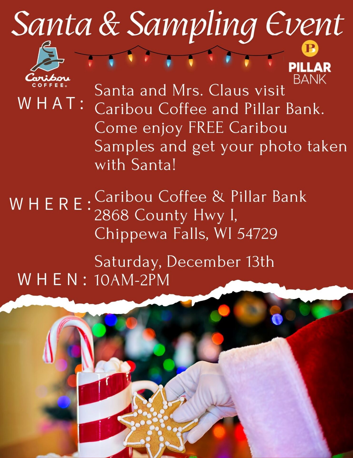 Join us on Saturday December 13th for a “Santa & Sample” event. Santa and Mrs. Claus will visit Caribou Coffee and Pillar Bank. Come enjoy FREE caribou samples get your picture taken. We will have a lot of Christmas activities like coloring pages and board games.