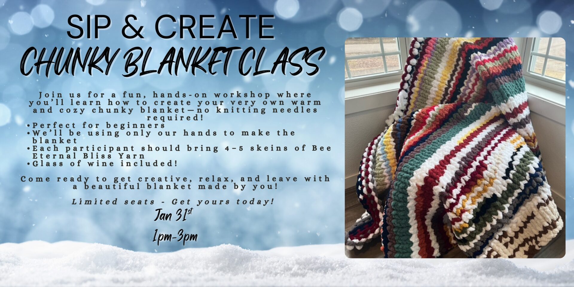 Join us for a fun, hands-on workshop where you’ll learn how to create your very own warm and cozy chunky baby size blanket—no knitting needles required!
