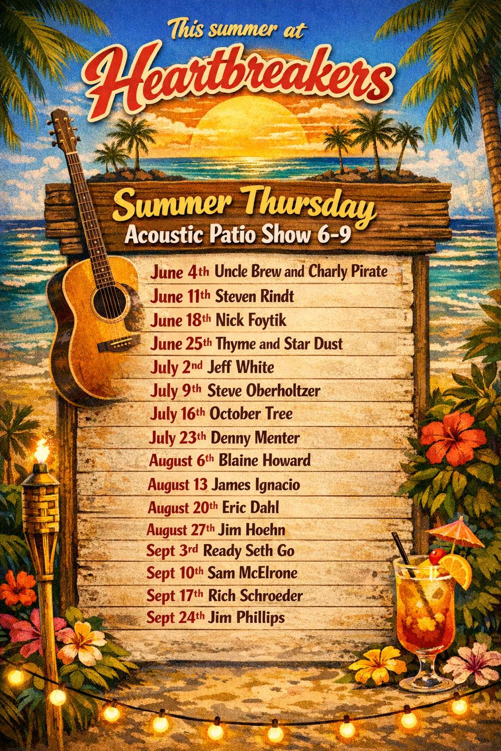 Come to Heartbreakers for the Summer Thursday Acoustic Patio show, 6:00 PM to 9:00 PM