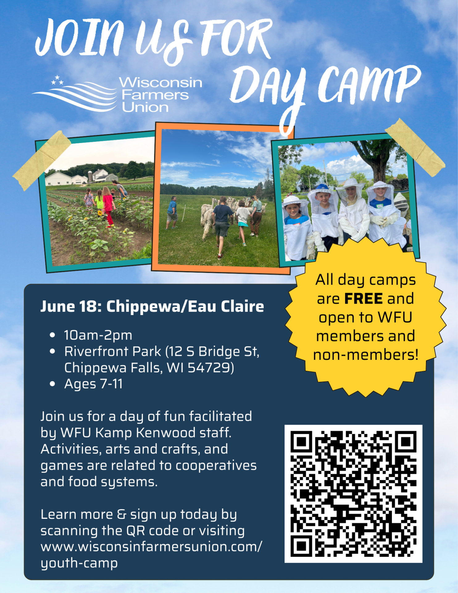 Wisconsin Farmers Union is hosting a free youth day camp at Riverfront Park in Chippewa Falls for kids ages 7–11.