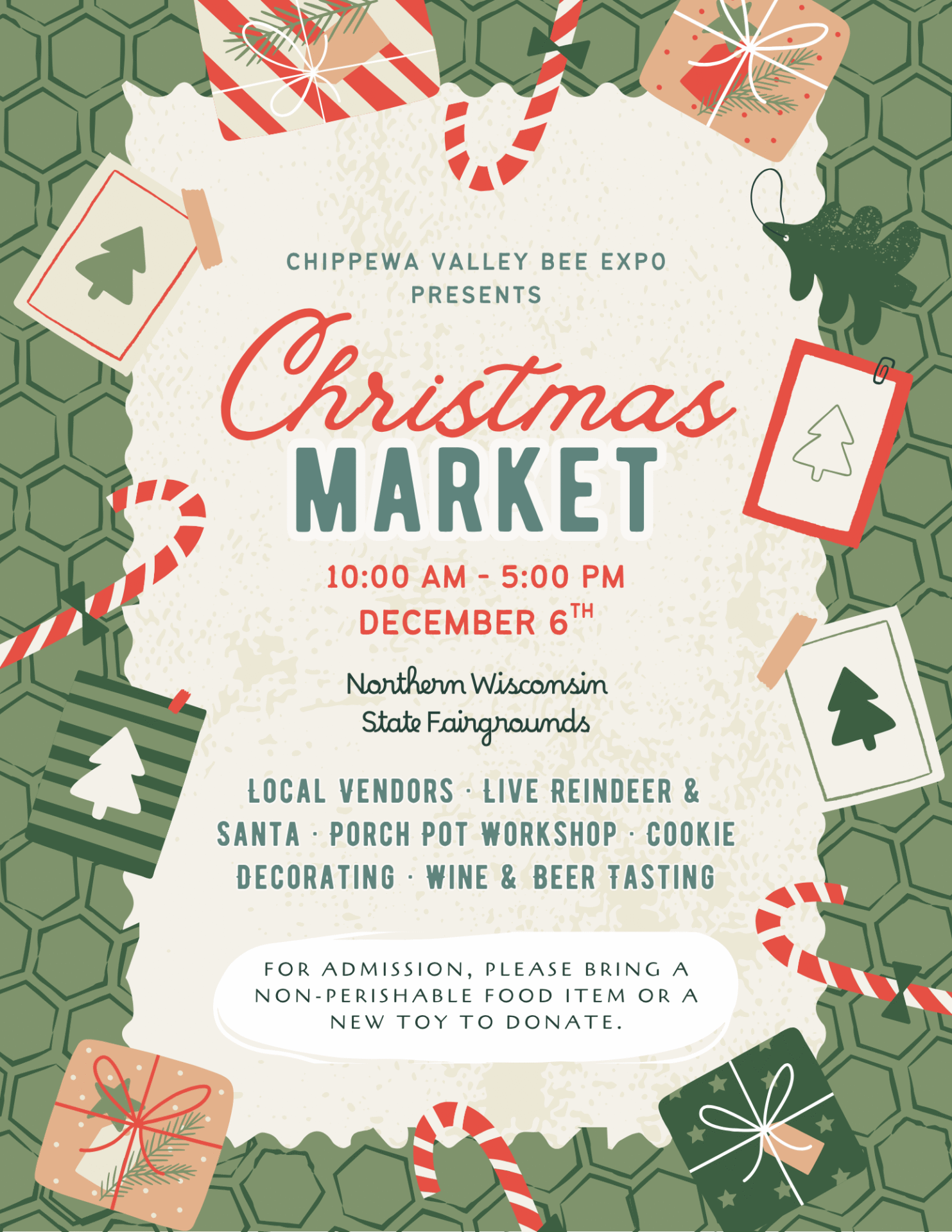 The Chippewa Valley Bee Expo invites you to its first-ever Christmas Market on Saturday, December 6, 2025, from 10 AM to 5 PM at the Northern Wisconsin State Fairgrounds in Chippewa Falls. This festive, family-friendly event will feature Santa and his live reindeer, a hands-on porch pot workshop, cookie decorating, and unique holiday shopping with […]