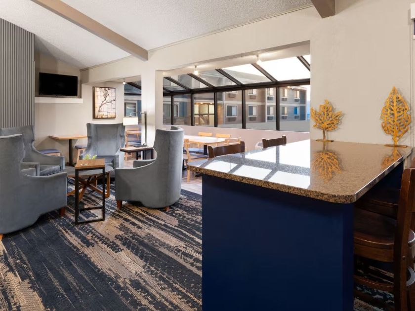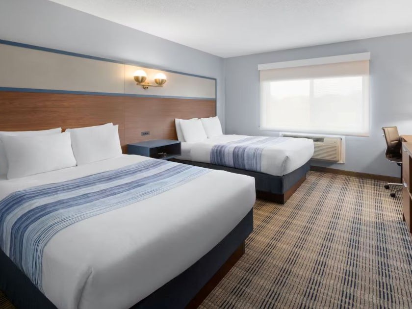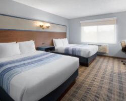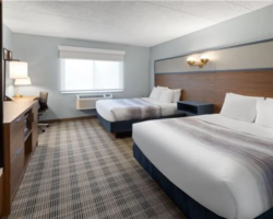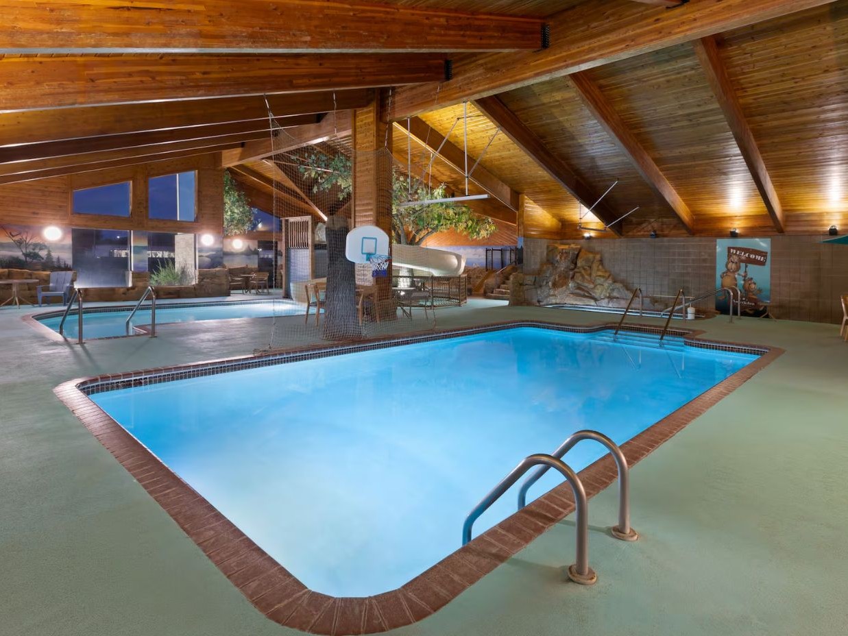 Start every morning with a free breakfast buffet of homestyle favorites before relaxing in their indoor pool and hot tub—or have some family fun at Splash Bay Adventure, featuring a water slide and children’s pool. On-site laundry facilities help keep your wardrobe fresh and free WiFi lets you plan your itinerary. Each non-smoking guest room is equipped with a flat-screen TV with cable, mini-refrigerator, microwave, coffee/tea maker, desk, ironing amenities, and hair dryer. You can also book a pet-friendly room for a small fee, or upgrade your stay to a suite with a jetted tub.
